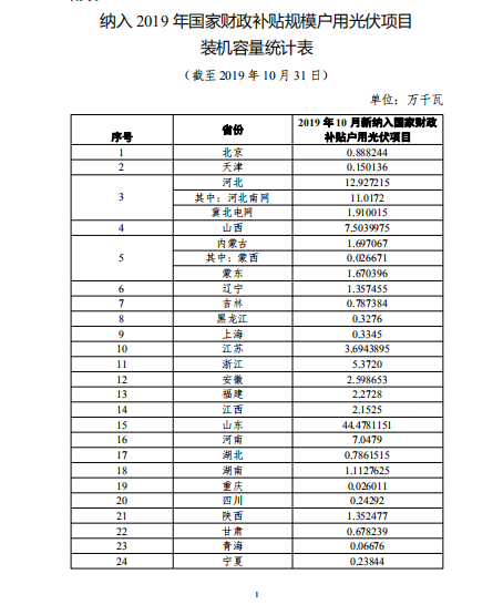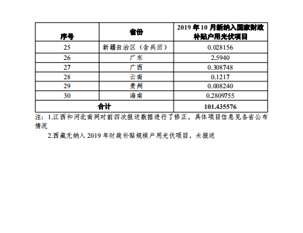 根據(jù)各省級能源主管部門、電網企業(yè)報送信息,經國家可再生能源信息管理中心梳理統(tǒng)計,2019年10月新納入國家財政補貼規(guī)模戶用光伏項目總裝機容量為101萬千瓦。
